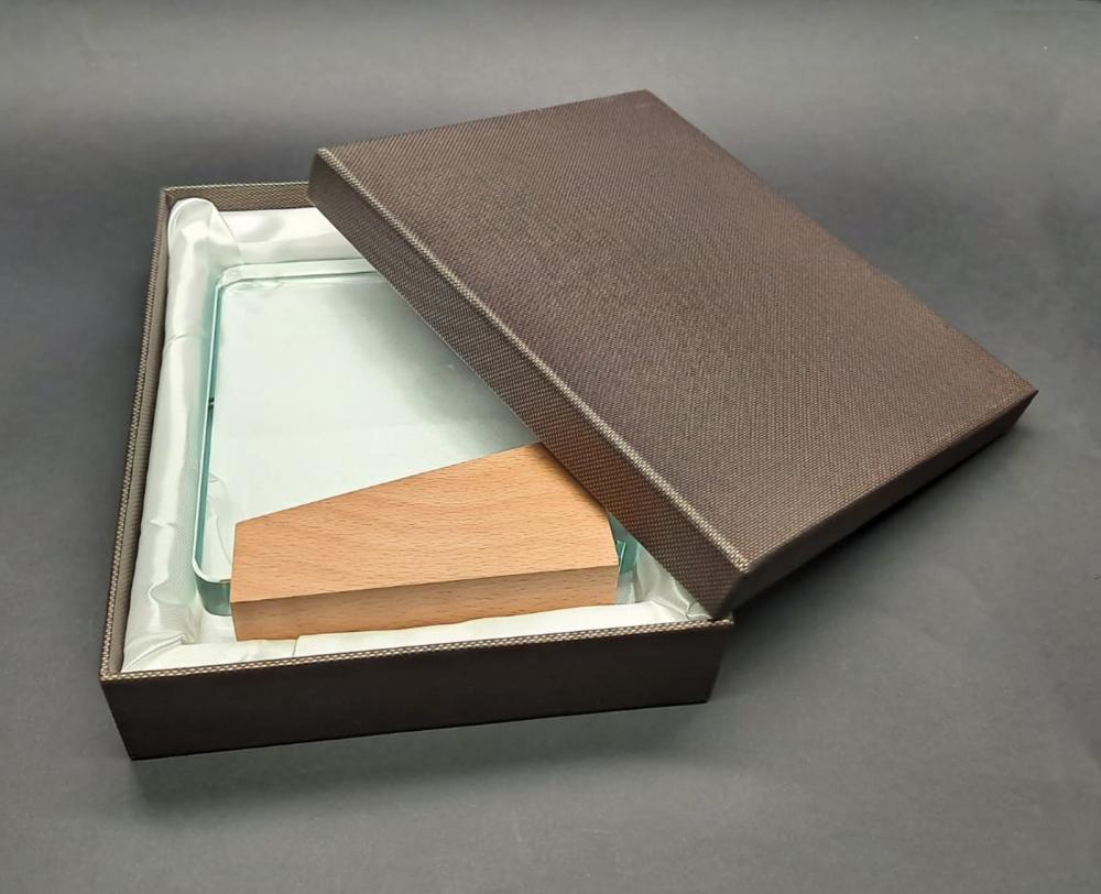 - بتصميم هندسي حديث، يأتي هذا الدرع بزجاج عالي النقاء، مقطوع بدقة ليعكس الضوء بانسيابية وأناقة. ما يميّزه فعلًا هو القاعدة الخشبية المصممة بانحدار مائل يخرج عن النمط التقليدي ليمنح القطعة طابعًا جريئًا ومعاصرًا.