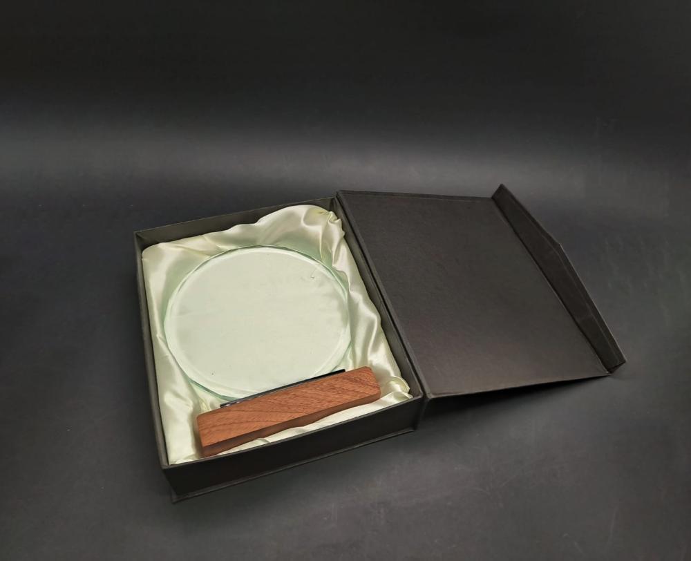 قاعدة خشب طبيعية بتشطيب أنيق مع امكانية الحفر او الطباعة لتمنح الدرع حضورًا راسخًا على الطاولات الرسمية والمكاتب الراقية