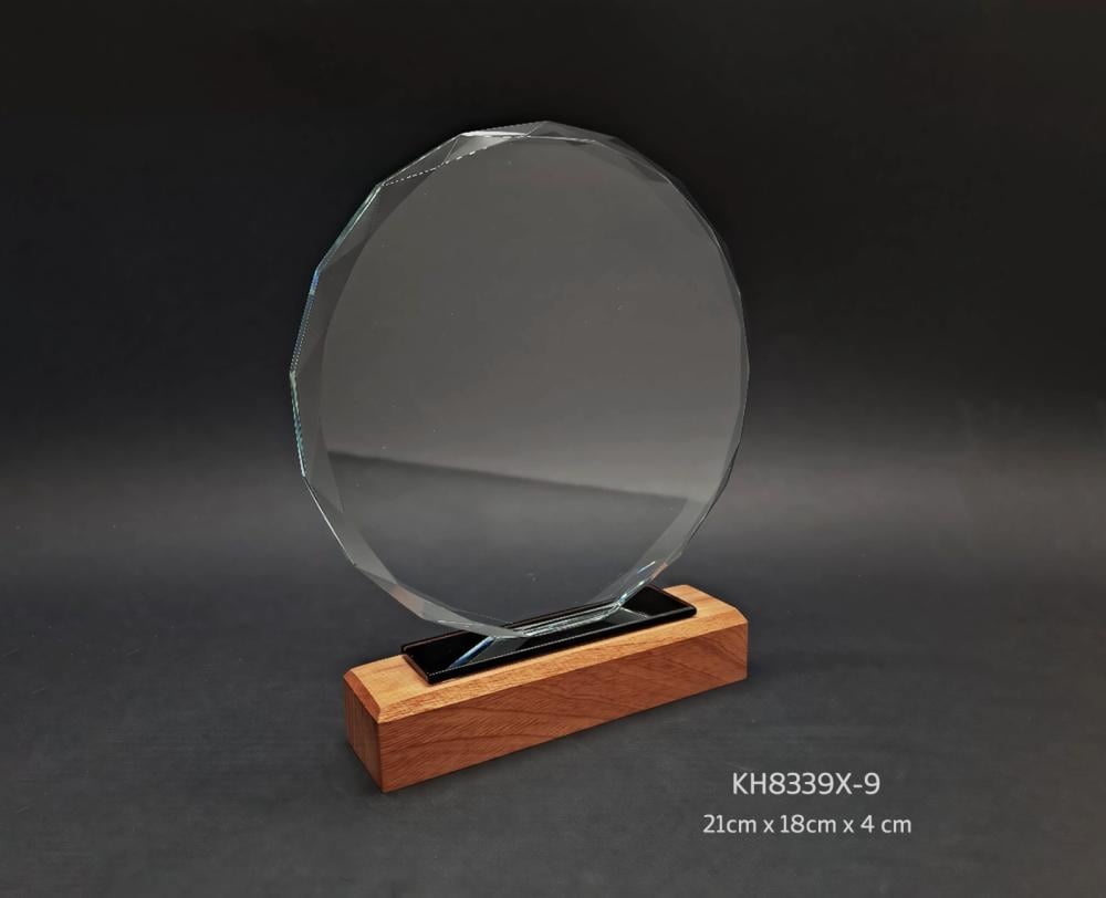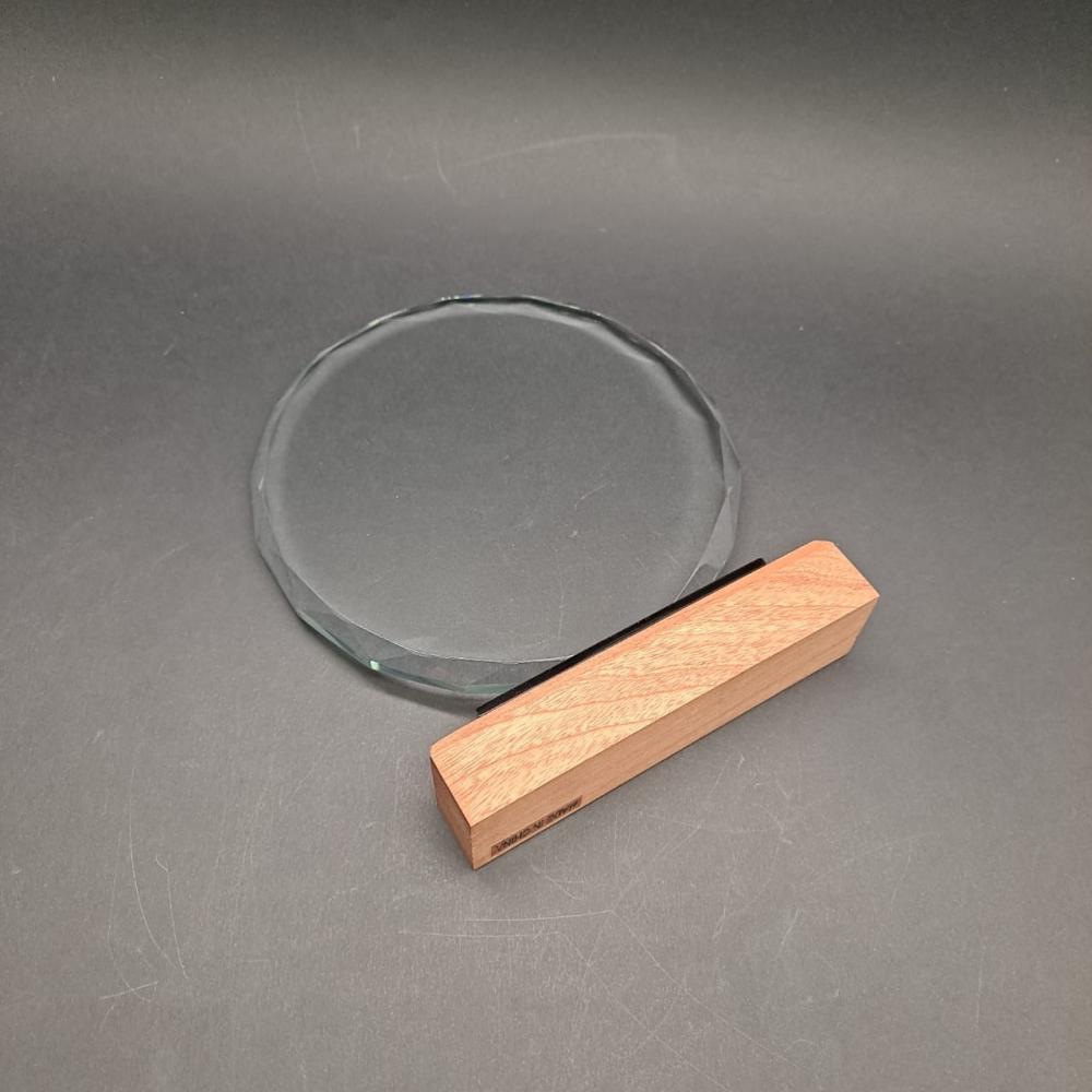 درع زجاجي فاخر بتصميم دائري شفاف بحواف مشطوفة لامعة، يرتكز بأناقة على قاعدة خشبية طبيعية تضيف دفء ورُقيّ لأي حفل تكريم.