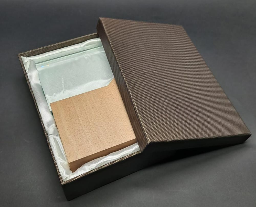 - المقاسات : الارتفاع 19 سم × العرض 12 سم × السماكة 3.5 سم – بحجم مثالي يوضع على المكتب أو في واجهة التكريم دون أن يطغى على المكان.