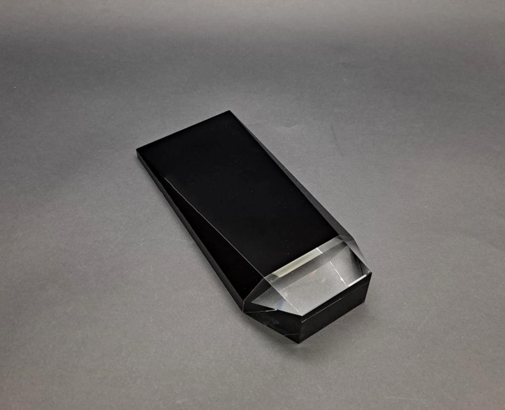 درع كريستال أسود بتصميم عصري مشطوف الزوايا يمنح التكريم طابعًا فخمًا وجريئًا في آنٍ واحد. مزيج من البساطة والقوة، يليق بالقادة وصناع الأثر.