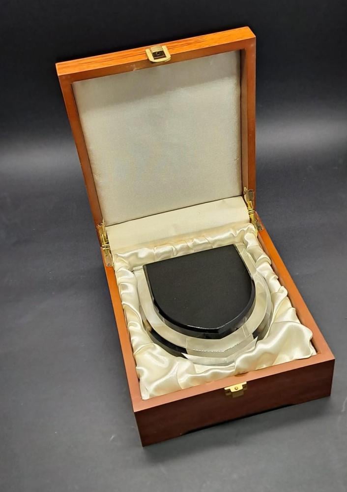 يأتي هذا الدرع داخل علبة خشبية فاخرة تزيد من قيمة الإهداء وتعزز حضور المناسبة.