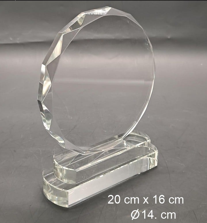 درع دائري بتصميم كلاسيكي جذّاب، يتميز بحواف مشطوفة تضيف لمسة فنية رقيقة على الإطار، مع قاعدة كريستالية مزدوجة تمنحه ثباتًا وأناقة.