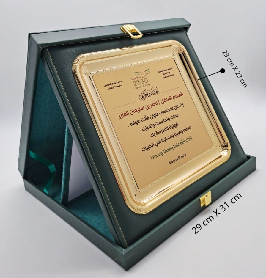درع أنيق بتصميم مستطيل معدني مطلي بلون ذهبي فاخر، يأتي داخل علبة جلد إيطالي بدرجة فاخرة من الأخضر الداكن، ليُمنح هديتك قيمة عالية ولمسة راقية. مثالي للتكريمات المدرسية، المؤسسية أو مناسبات التميز الشخصي.